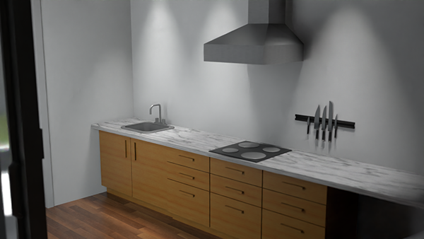 I then proceeded to add more elements to create a realistic scene, such as furniture, kitchen wardrobes, cookware, lamps, decorative things and the like.