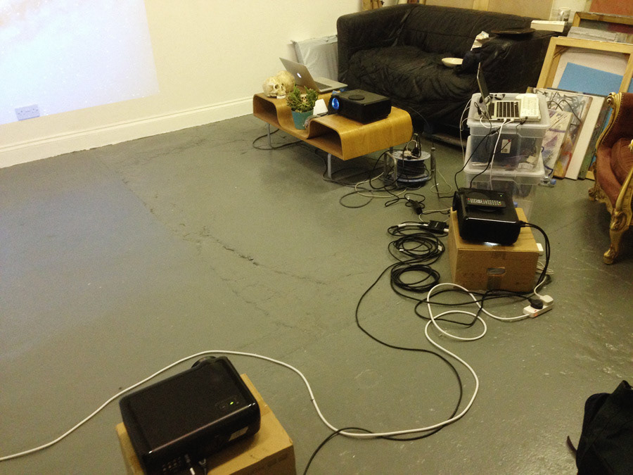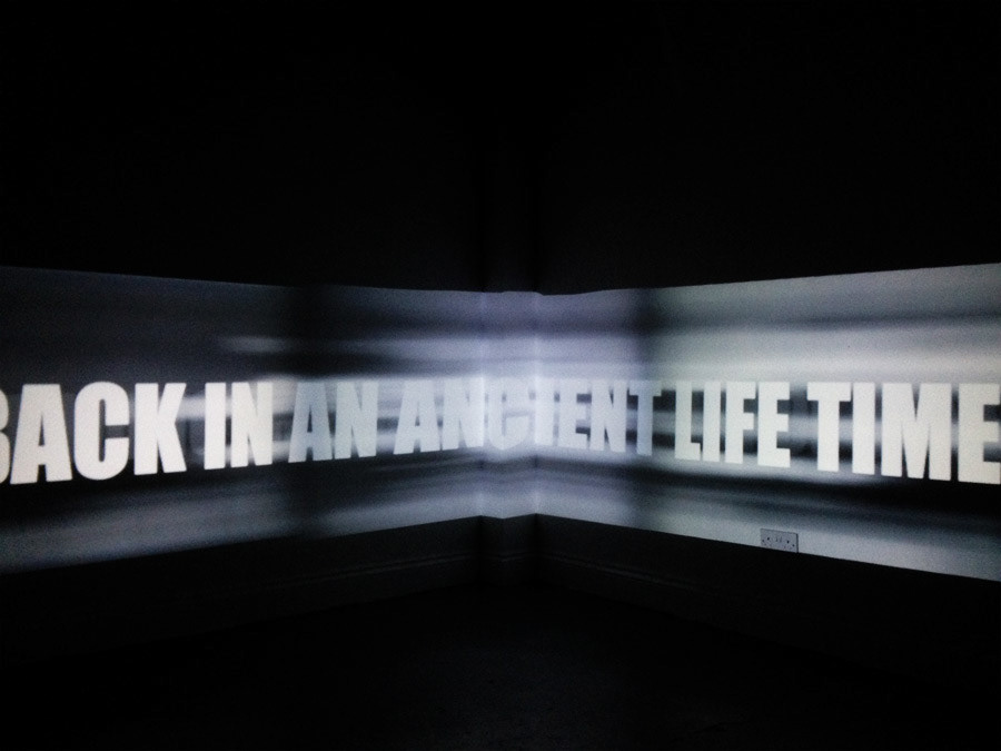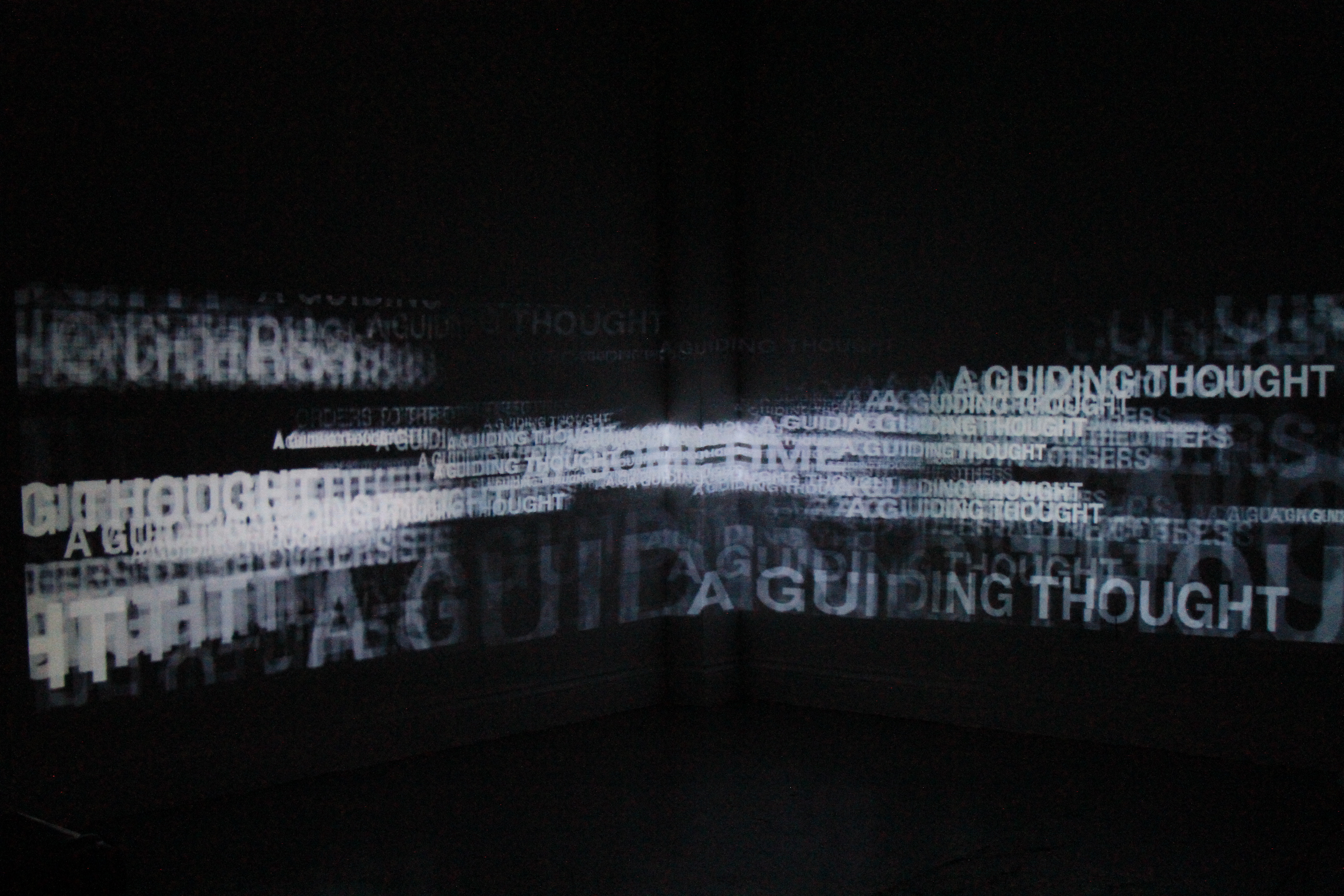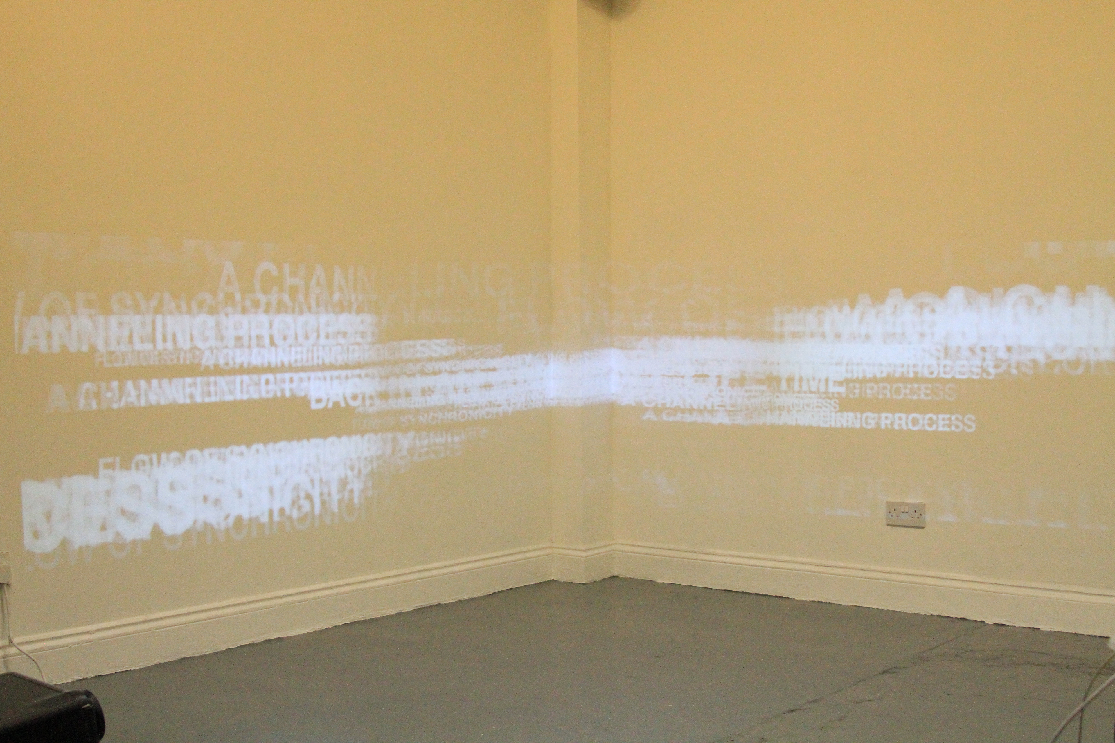 ‘Text Project(ion)’ is a live interactive multimedia installation, with text fading in and out of legibility, transitioning randomly between effects. With a microphone pick up capturing both the soundscape and the unassuming viewer, interacting with the moving image: creating a link between the viewer and the piece, as if the thoughts/text get distracted by the visitor’s presence.