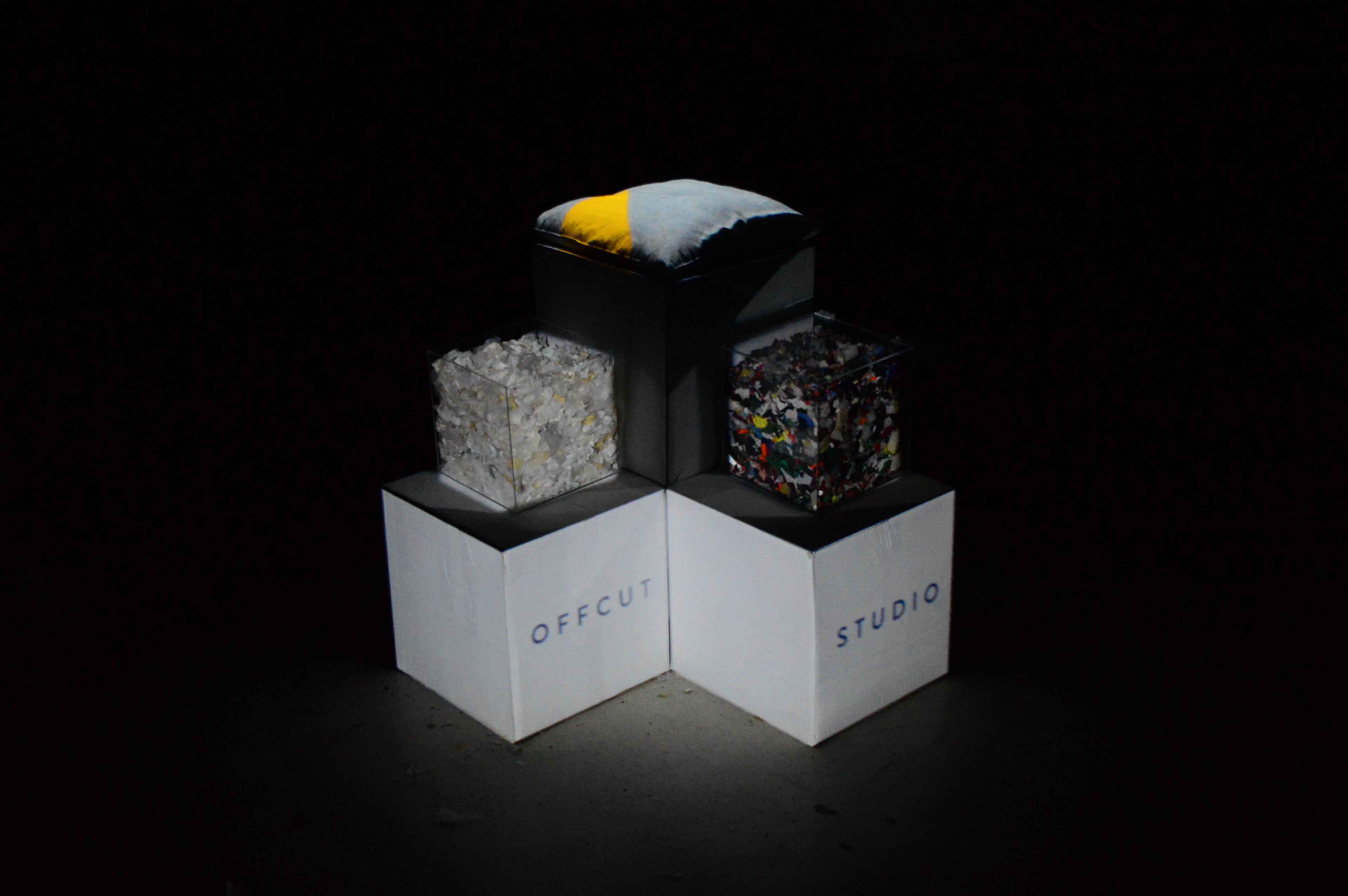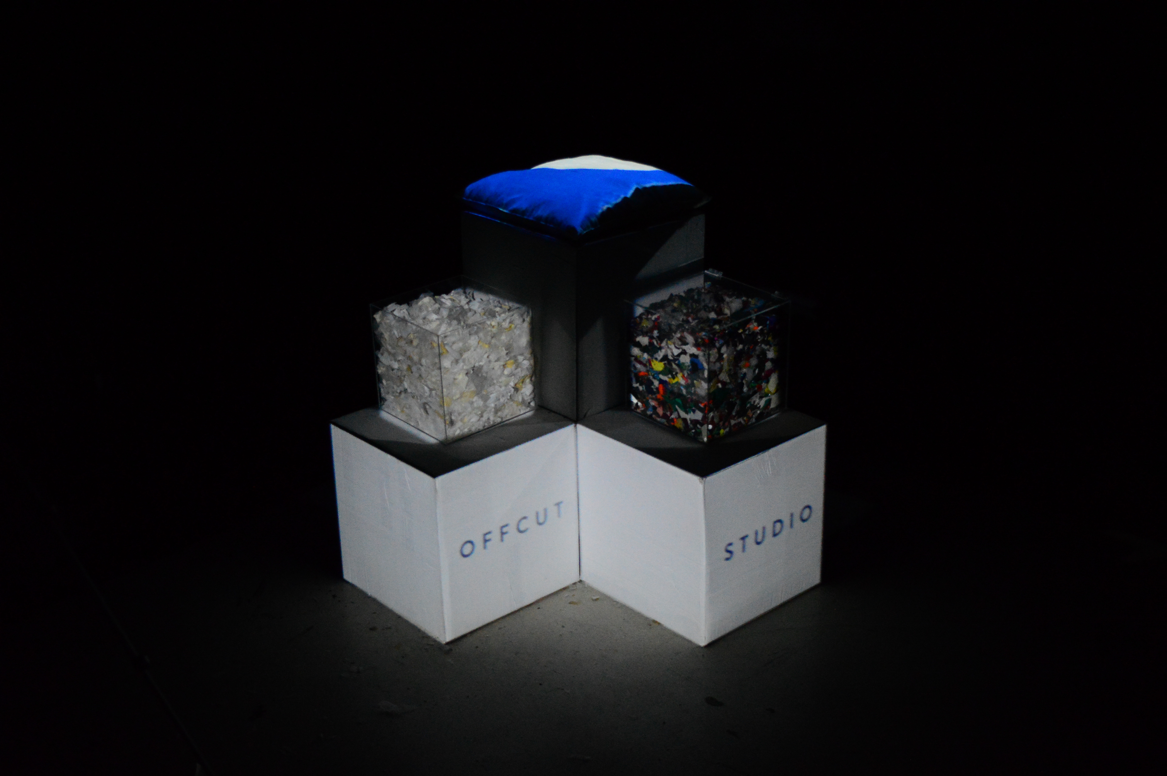 For Offcut Studio when rebranding, I created a projection mapped visualisation of the process undertaken by the company, when creating their products, in a circular economy manner. Being conscious of the wast from the fashion indsutry and it's huge impact on the planet, making the best use of scraps.