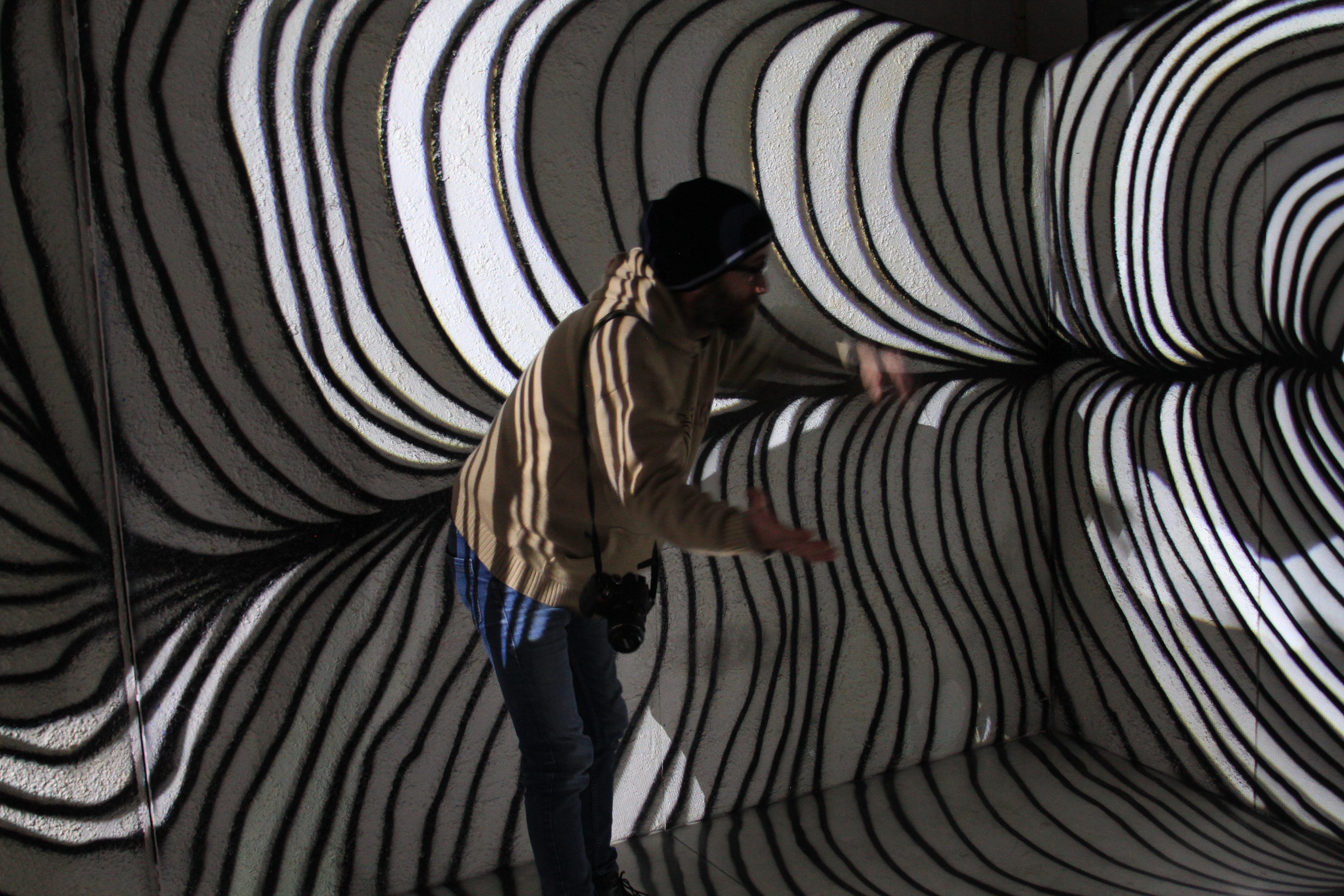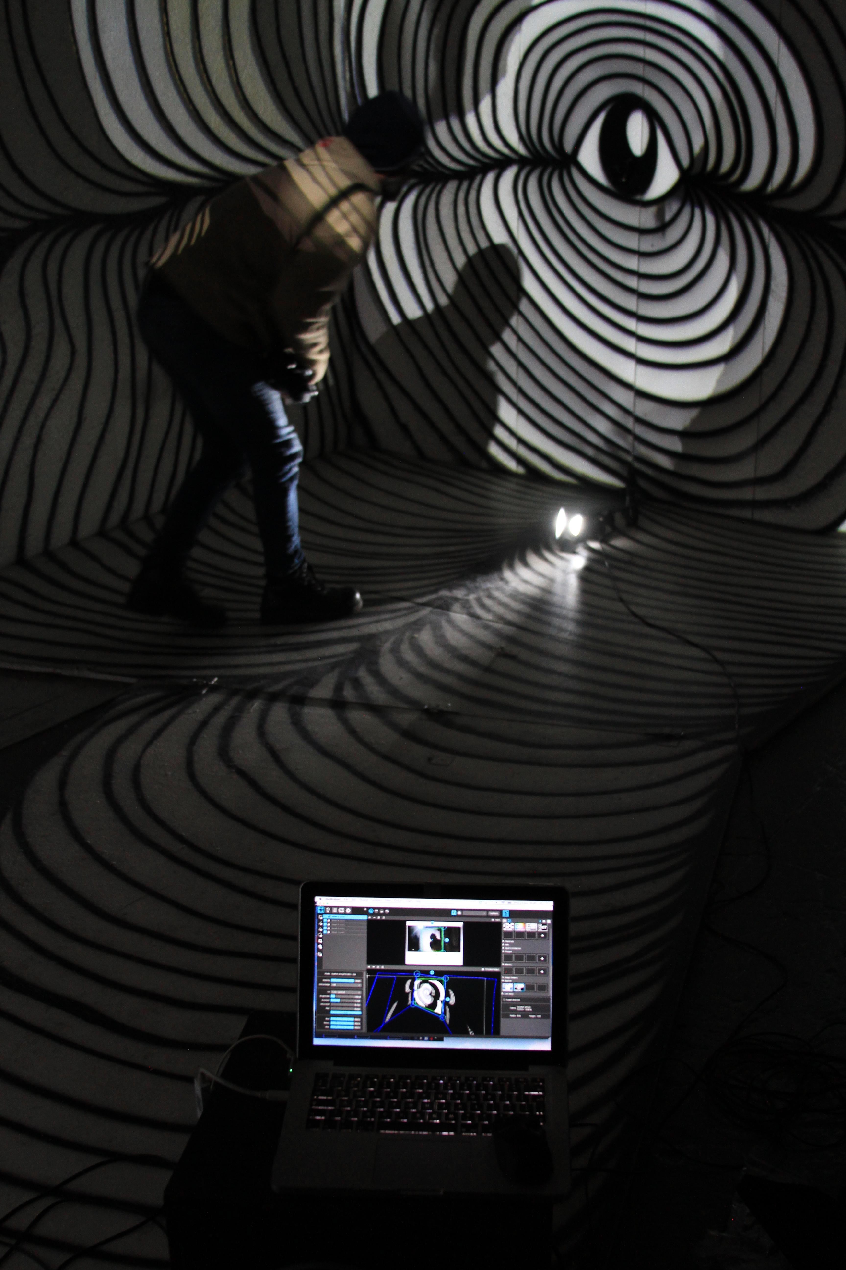Using two parallel, simultaneous projectors covering a wide space, while one camera acts as the Eye and returns the visitor-interactor's ‘aura’ into the set.