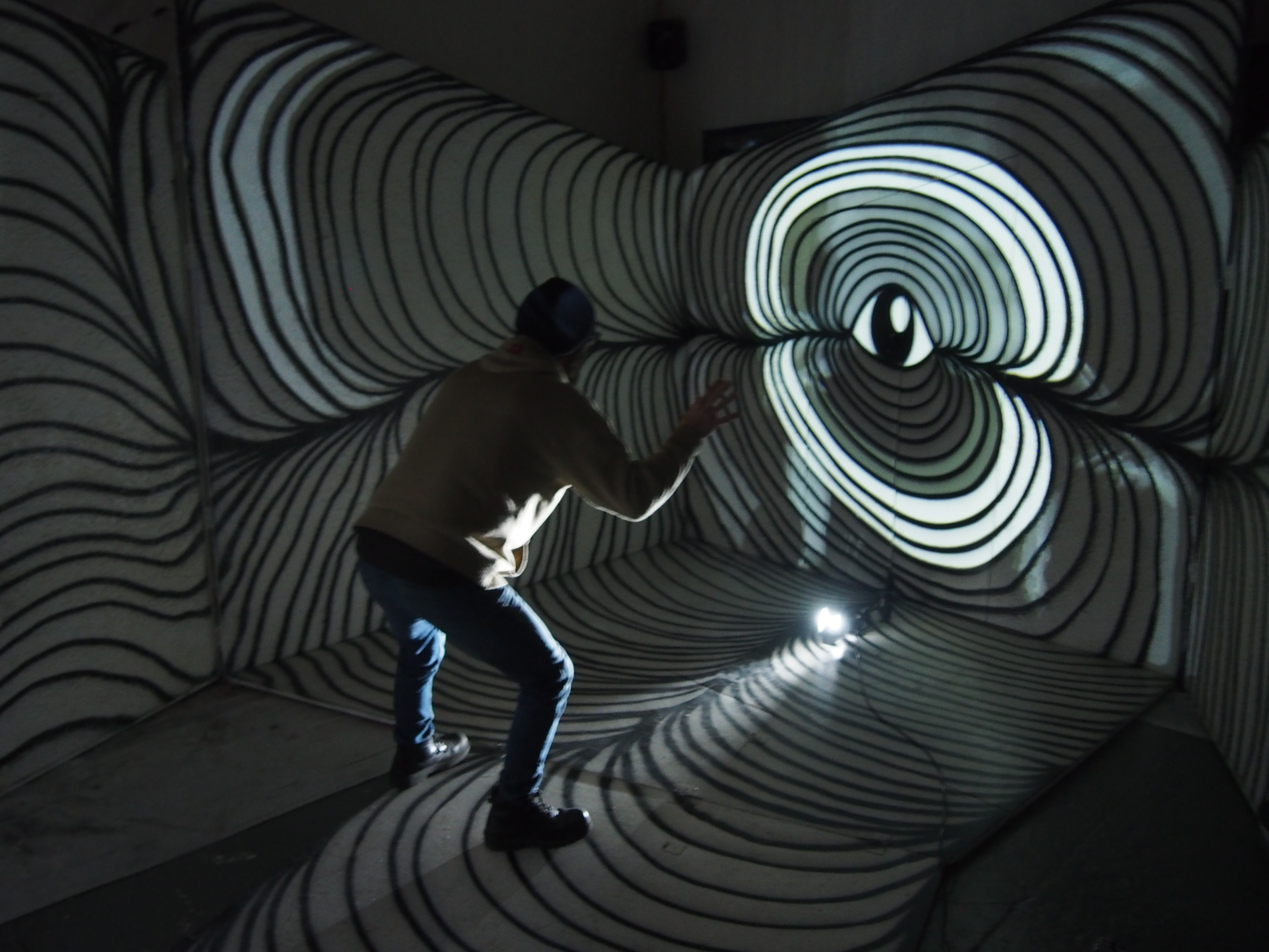 If one person moves around they see their aura projected as the eye sees them, and their location makes variations in the sounds creating unique audiovisual results - more people, more auras and sound.