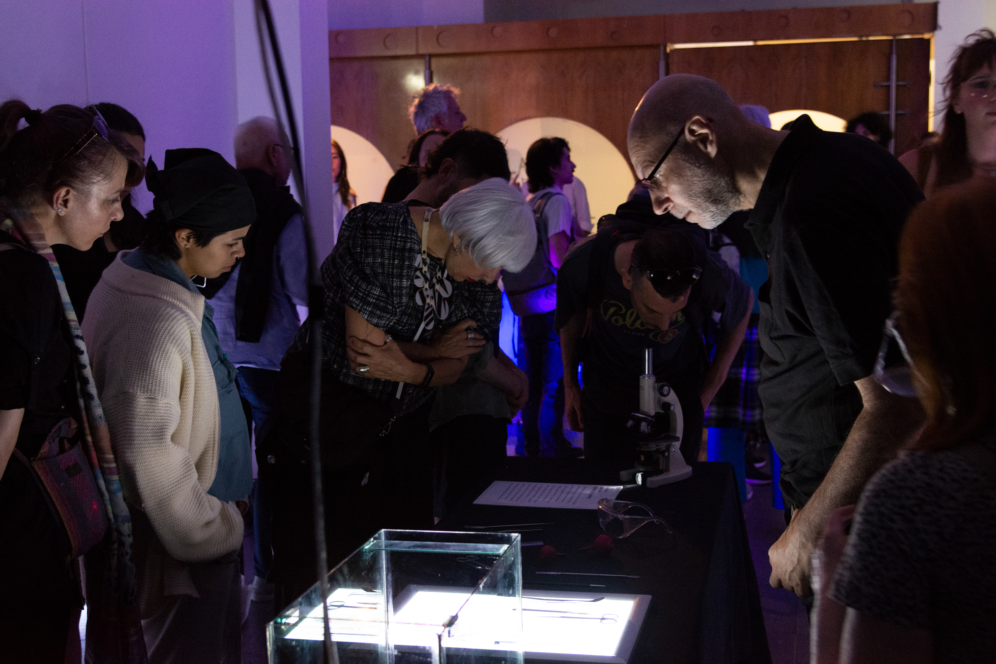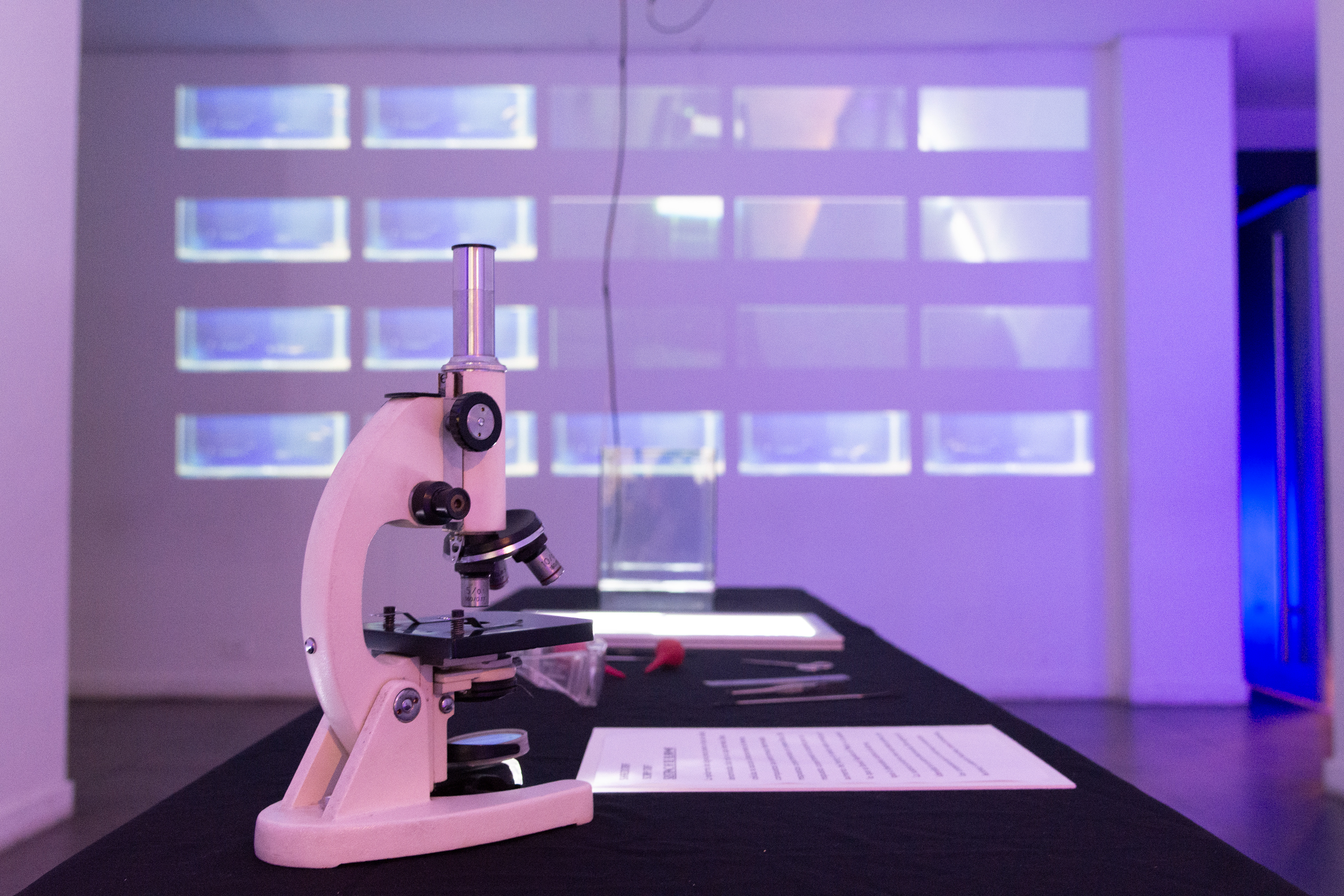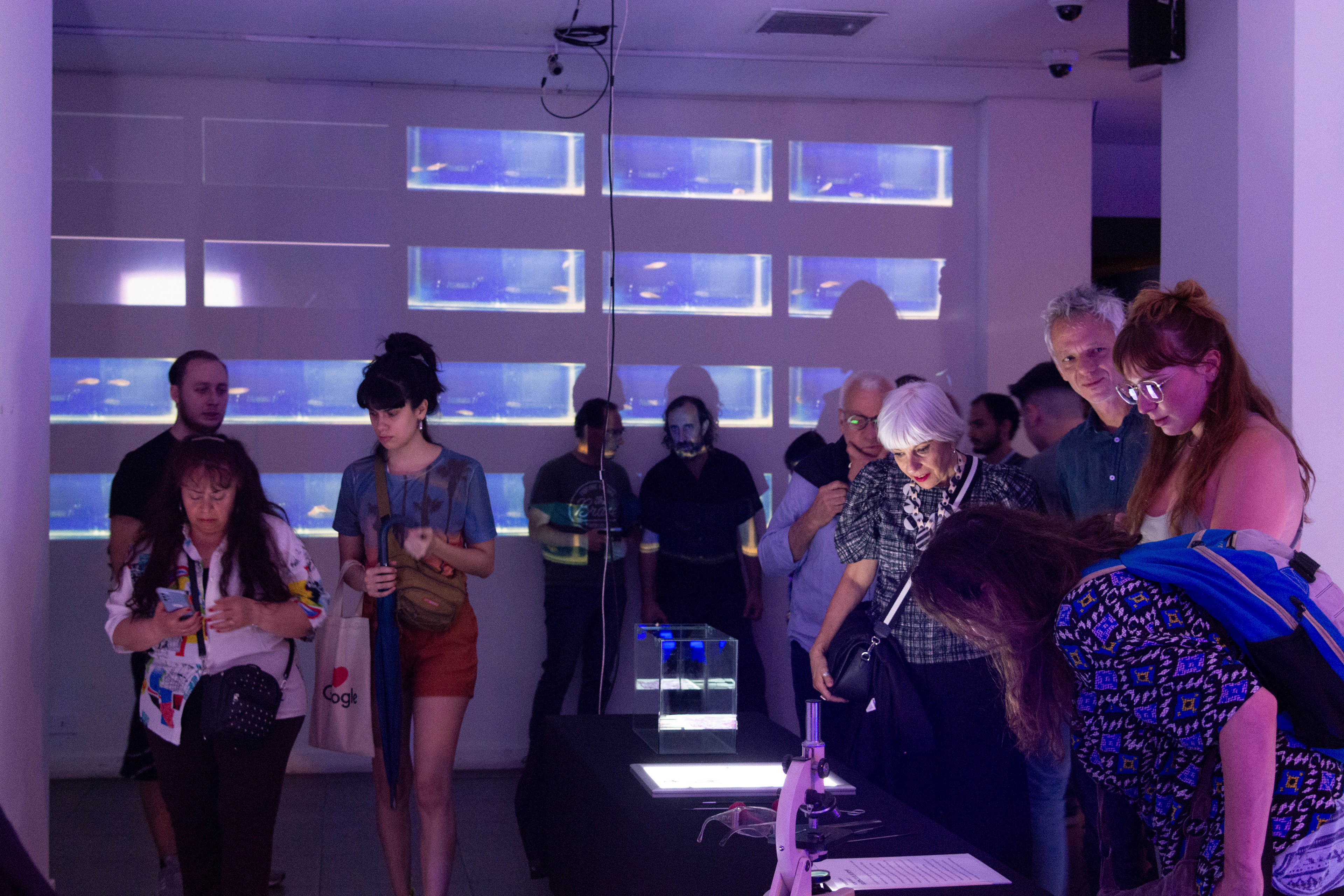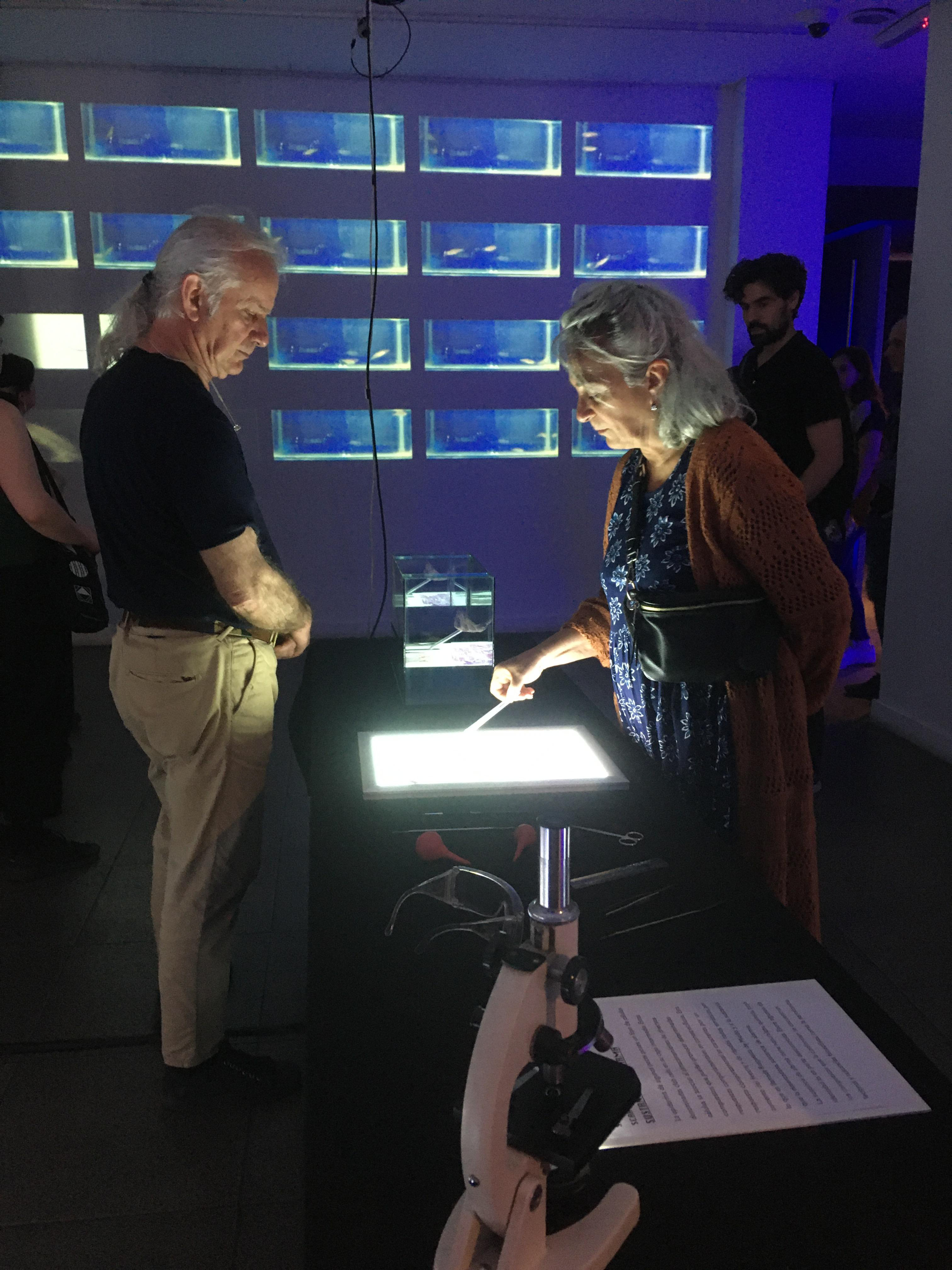 In this interactive work, viewers are immersed in a laboratory, surrounded by scientific elements and tools such as microscopes, tubes, beakers, Erlemeyers, falcon tubes, petri dishes, pipettes. On one side of the laboratory, 25 fish tanks with multiple specimens swimming inside.
